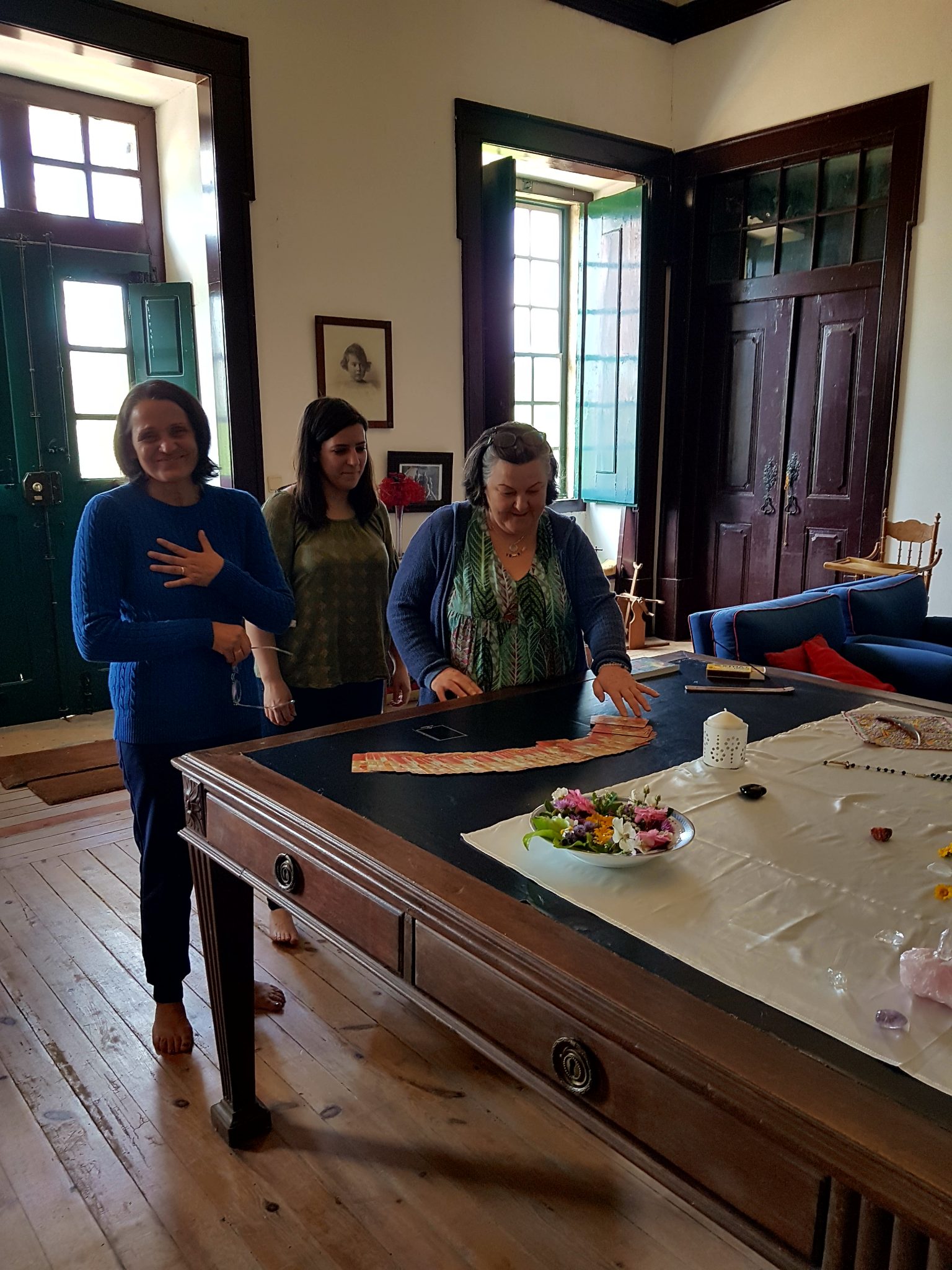 - Hari, Vera & Amber using oracle cards beside their altar